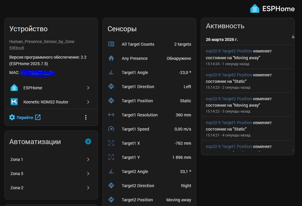 Zone.h Text - необходимая библиотека для работы с датчиком. В HA через File Editor просто забрасываем её в homeassistant/esphome. После чего можно смело прошивать ESP32. Появится новое устройство, которое дальше мы и будем настраивать.