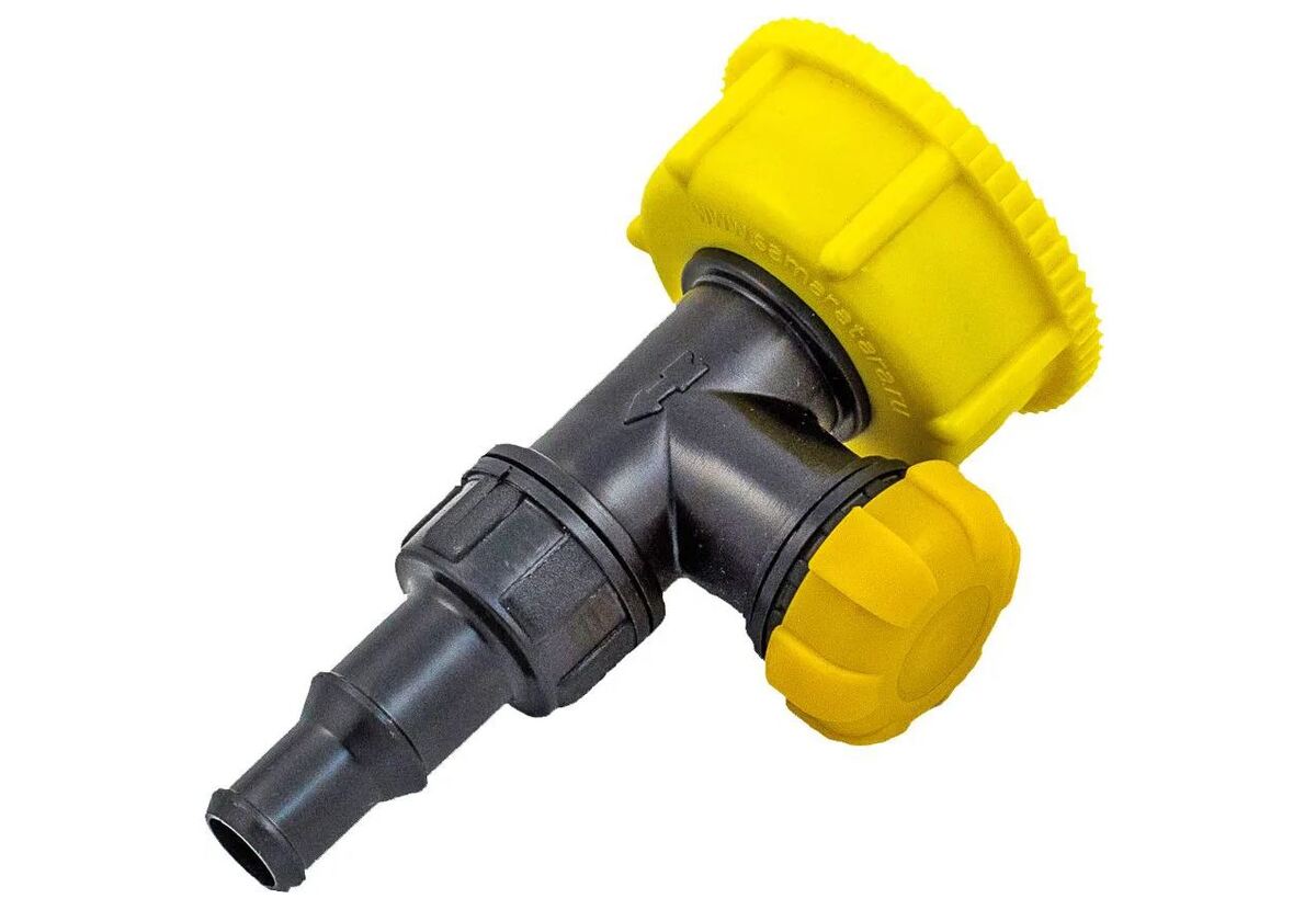 Канистра ставится кверху дном, в крышке сверлится отверстие под штуцер. Их есть много различных вариантов. У меня металлический с прокладками, но есть и вот такие пластиковые: